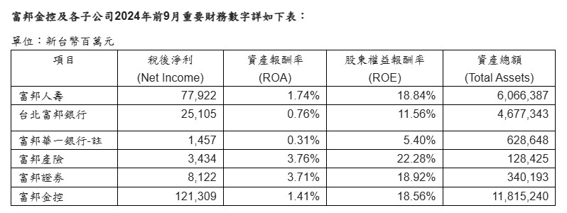 富邦金旗下子公司富邦人壽前9月稅後淨利位居市場第一;台北富邦銀行前9月稅後淨利續創歷史同期新高,並已超越去年全年獲利;富邦證券營收顯著成長,前9月獲利年增48.0%;富邦產險利潤持穩增加,簽單保費收入續居市場龍頭。