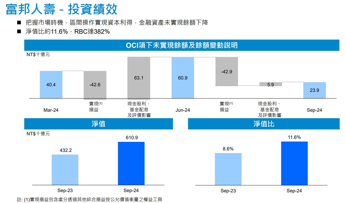 截至9月底富邦人壽淨值比約11.6%,資本適足率(RBC)達382%。