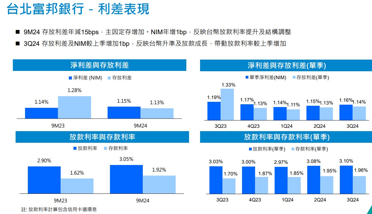 北富銀前9月淨利差(NIM)年增1bp,逾期放款比率0.11%、備抵呆帳覆蓋率1140.89%;手續費淨收益年增39.7%,其中財富管理手續費收益年成長37.2%。