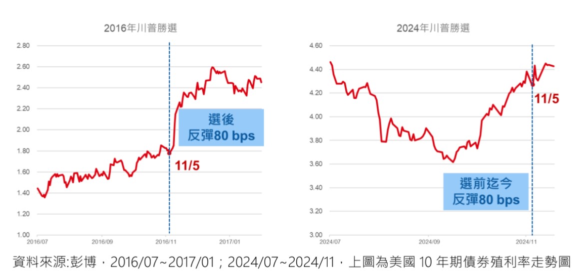 滙豐投信表示,回顧 2016 年美國大選,殖利率在川普意外勝選之後才開始彈升、幅度達 80點;而本次殖利率彈升卻早在聯準會9月啟動降息之後,率先反應川普勝選情境,殖利率從3.6%一路上漲至4.4%,彈升點數達80點,已經與「川普1.0」時代的「川普交易」相去不遠,合理推估殖利率本波彈升幅度應接近滿足點。