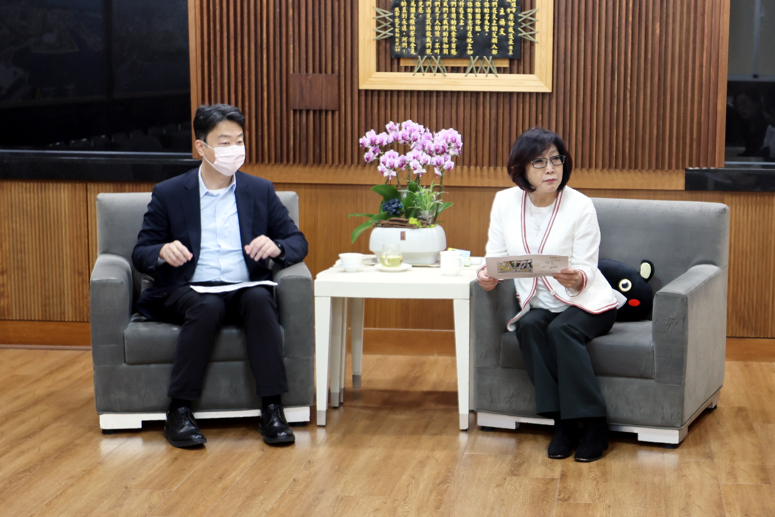 圖說:陳世凱(左)親向康裕成(右)說明「高鐵延伸屏東」路廊方案。(圖片來源:高雄市議會提供)
