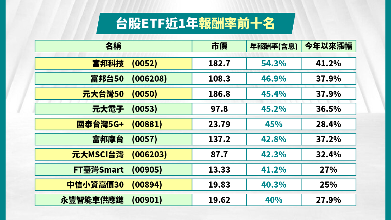 台股ETF績效10強一表掌握!近1年報酬40%起跳 最平價黑馬是它