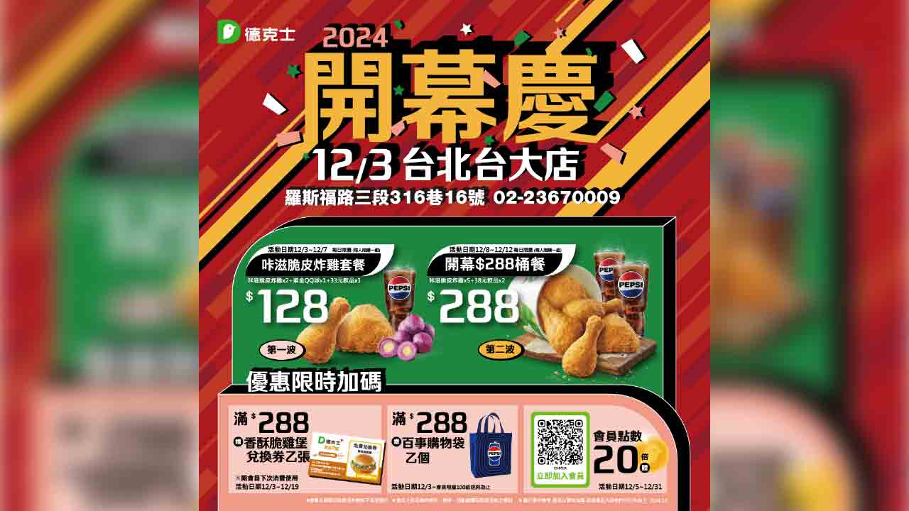 為慶祝台大店開幕,德克士推出五重優惠:開幕首5日推出「咔滋脆皮炸雞套餐」65折特價128元;緊接著12月8日至12日推出288元桶餐,內含5塊炸雞與2杯飲品。此外,12月3日至19日消費滿288元可獲贈香酥脆雞堡兌換券,12月5日至31日會員享20倍點數回饋,相當於20%現金回饋,開幕期間更推出限量百事購物袋贈送活動。