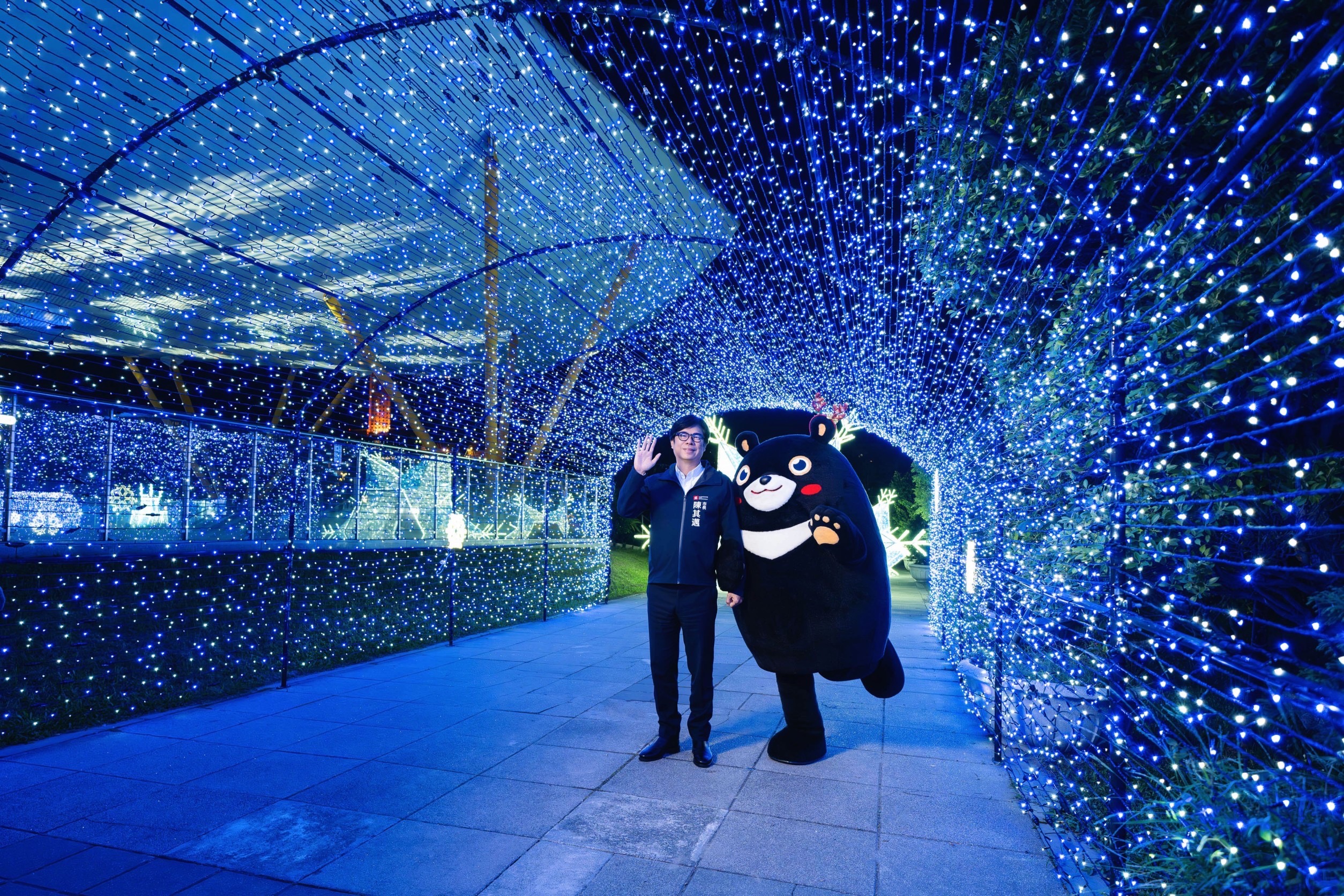 ↑圖說:陳其邁及高雄熊與聖誕主燈「森之樹」及「星海隧道」合照。(圖片來源:高雄市政府提供)