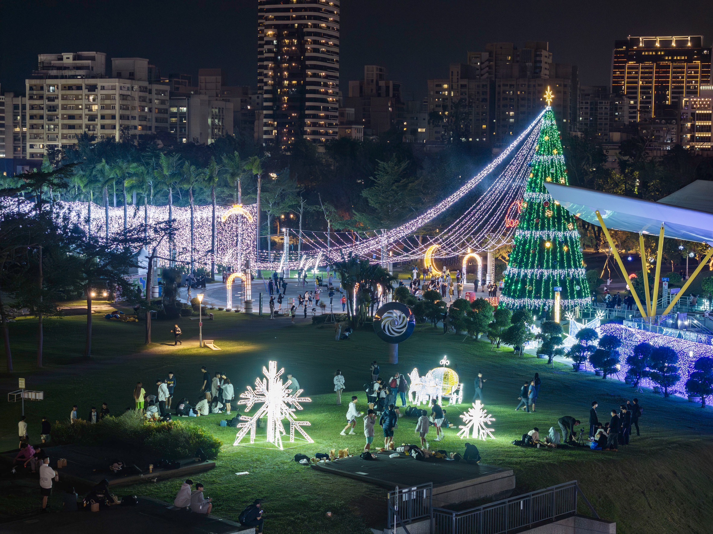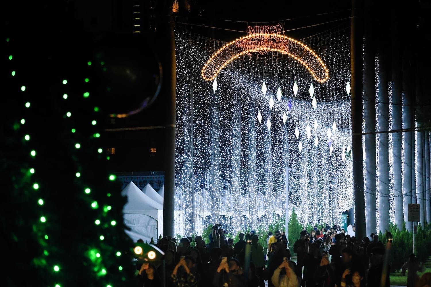 今年的聖誕主燈「森之樹」位於中央公園站1號出口,高26公尺,以自然純粹的綠色為主調,讓人彷彿置身森林懷抱。主燈上以金色燈球和點點星光環繞,頂端閃耀的星星與四射的燈光交織出動人的光影效果。每隔15分鐘,聖誕樹頂部更會飄落浪漫的泡泡雪花,為南台灣帶來獨特的聖誕氣息,吸引大批遊客駐足拍照。燈區內還有入口的「聖誕禮頌」、閃耀的「星海隧道」、草坡上的「Sweet Memory」與「霓光星球」,以及湖畔的「月光祝福」等特色裝置,讓人流連忘返。