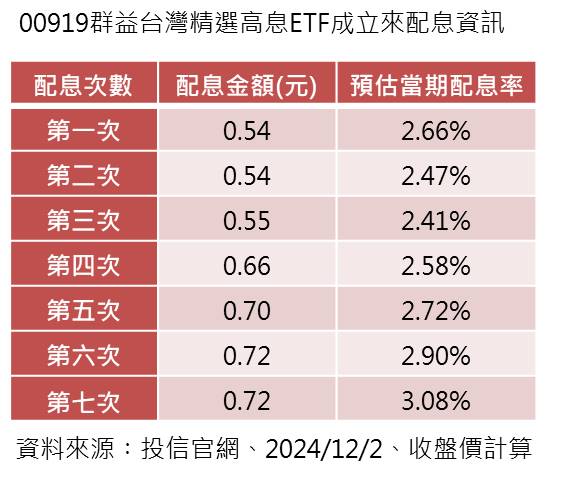 法人表示,00919這7次配息金額分別為0.54、0.54、0.55、0.66、0.7、0.72、0.72元,配息政策偏向穩定階梯式向上,以今(2)日收盤價23.42元來計算,年化配息率近12.3%,連續7季衝破10%,再度刷新台股ETF配息紀錄,統計逾103.3萬投資人可望同步受惠。