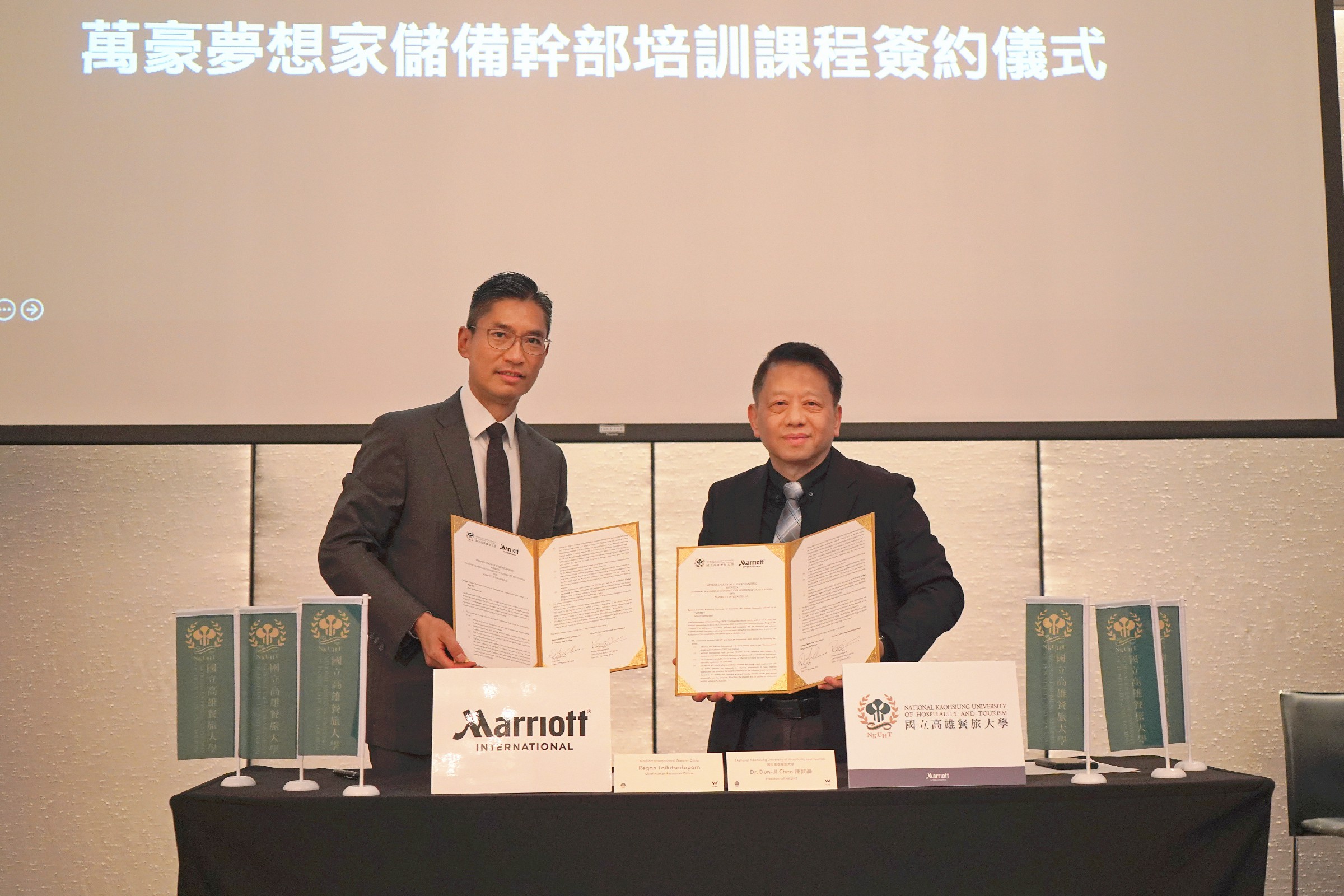 12月1日,高餐大校長陳敦基與萬豪國際集團大中華區首席人力資源官戴經緯(Mr. Taikitsadaporn)共同簽署「萬豪夢想家儲備幹部培訓計畫」,開啟校企合作的新篇章。該計畫為學生提供起薪新臺幣3萬至3.1萬元,經過前六個月的學習、觀察與行為面試考核後,薪資將調升至新臺幣3.2萬至3.3萬元。同時,量身打造的個人化培訓計畫,協助學生在各領域中深耕,為其未來職涯奠定穩固基礎。