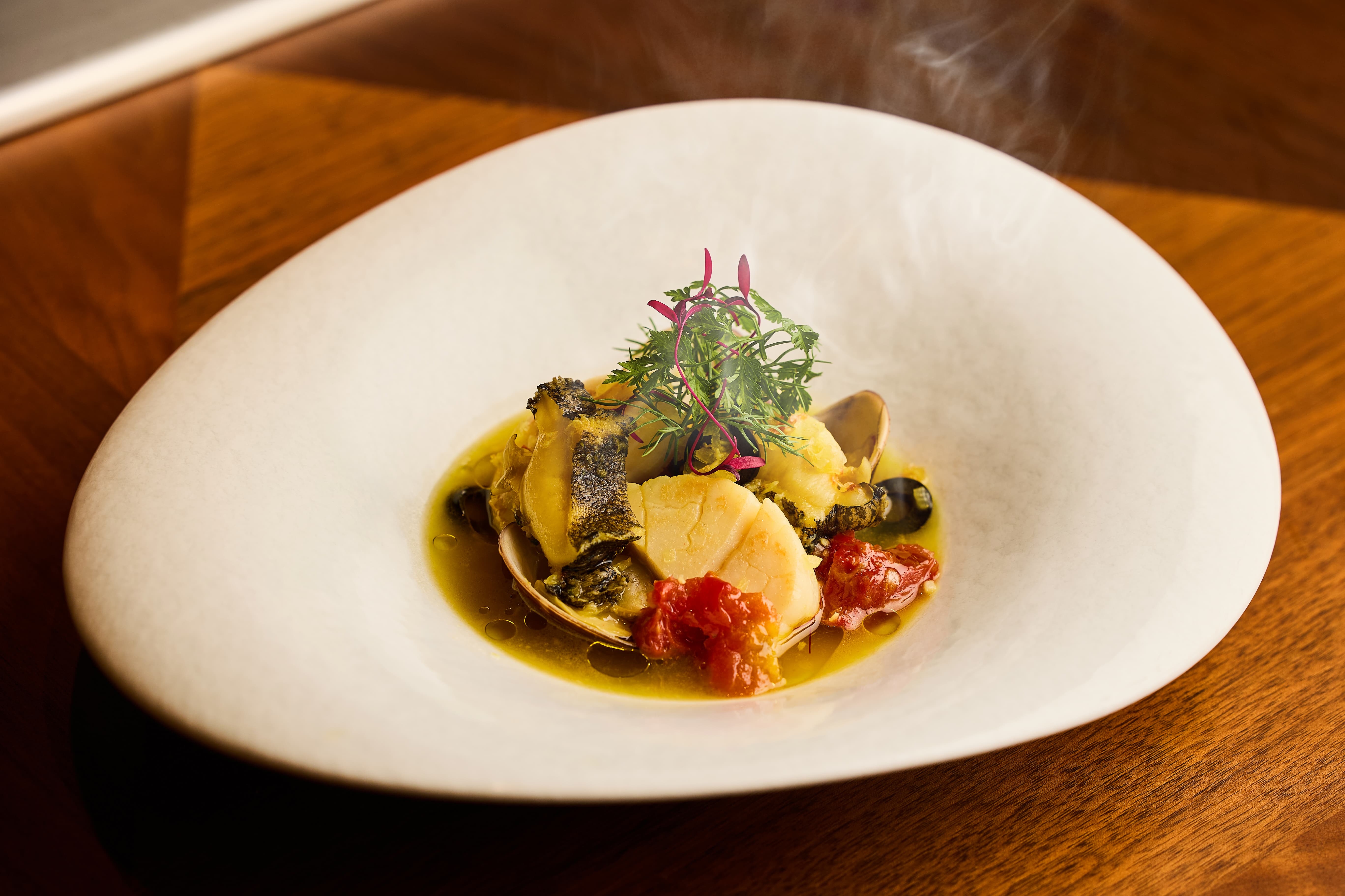 Ukai-tei鐵板燒冬季菜單聚焦季節限定食材,呈現「日本蕪菁 黑松露」的純粹與奢華。「銀鱈 百合根」則透過高溫鐵板煎製,展現寒鱈肥美鮮嫩的質感,搭配百合根與濃郁奶油醬,溫暖而滿足的滋味令人難忘。還有「鮑魚 干貝 番紅花湯品」,以鮮嫩海味搭配番紅花湯底,完美捕捉大海的旨味。每一道料理都讓人感受到高超的技藝與對季節的尊重。