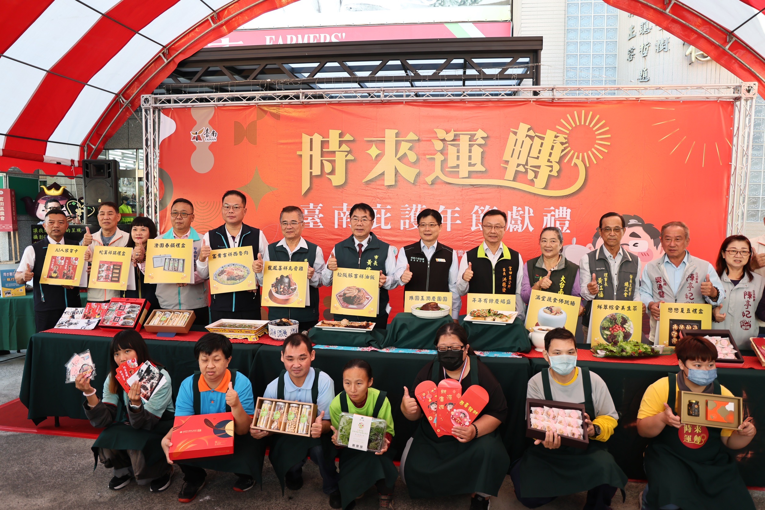 小龍年將至,臺南市勞工局攜手7家庇護工場推出暖心年節商品!12月4日舉辦的「『時』來運轉─台南庇護年節獻禮」行銷記者會上,臺南市長黃偉哲親自站台,號召市民購買庇護年菜與禮盒,用行動支持身心障礙者就業,讓年節更添愛心與溫情。活動於官田區農會超市前舉行,勞動部雲嘉南分署分署長劉邦棟、議員吳通龍等嘉賓一同出席,共襄盛舉。
