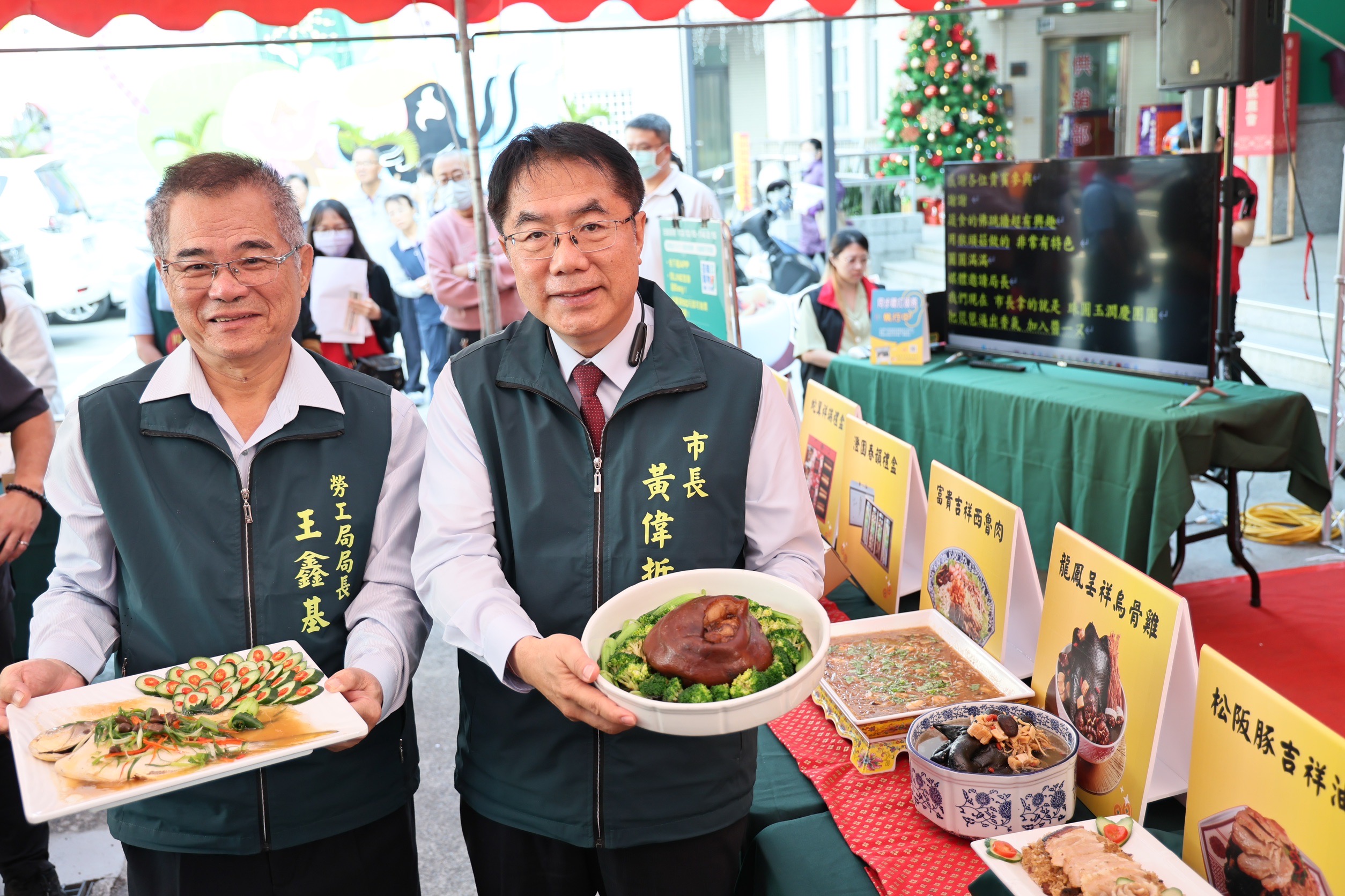 ↑圖說:台南市長黃偉哲與勞工局長王鑫基號召市民購買庇護年菜與禮盒,用行動支持身心障礙者就業,讓年節更添愛心與溫情。(圖片來源:台南市勞工局提供)