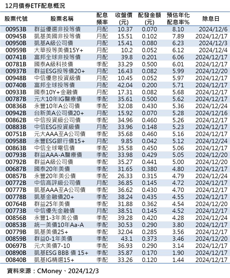 觀察債券ETF配息概況,共有34檔債券ETF在本(12)月除息,扣除已經除息的2檔,還有32檔等著除息,其中以00953B群益優選非投等債,預估年化配息率8.12%最高。00953B將於明(6)日除息,收益配發日為12月27日,想參與本次領息的投資人,最後買進機會只剩今(5)天。