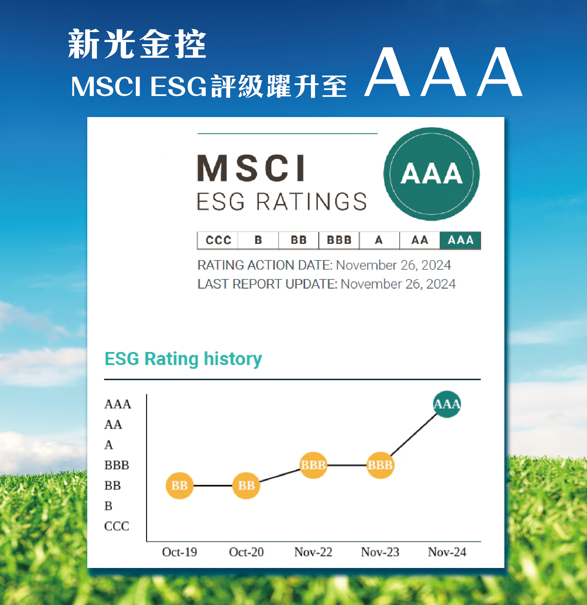 新光金表示,MSCI ESG Ratings是全球投資者公認最具權威的ESG評級之一,藉由檢視企業在環境、社會、公司治理三大面向,包含氣候變遷脆弱度、人力資本發展、資訊安全、責任投資、公司治理等7大主題表現,將企業的ESG管理水平劃分為七個級別(AAA至CCC)。