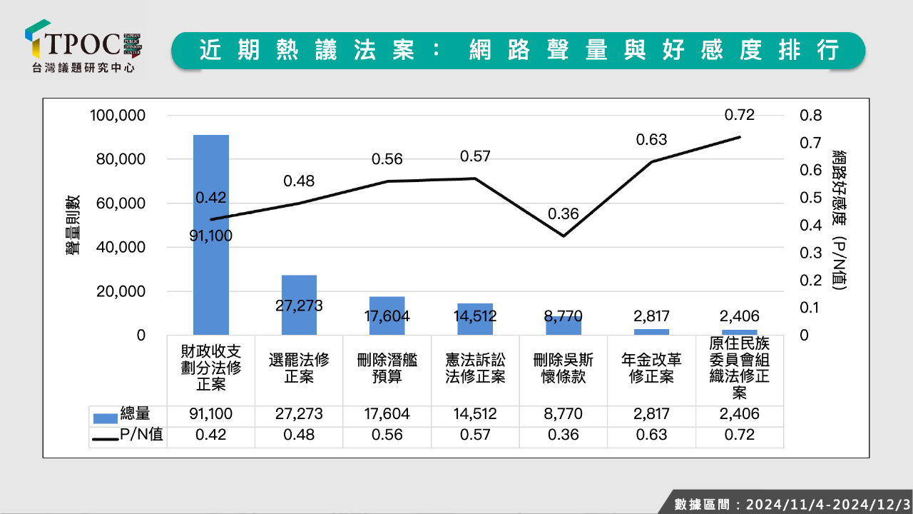 至於吵翻天的《選罷法》修正,總聲量突破2.7萬則規模,聲量排行第2,好感度約0.48,主要熱門留言來自綠營,例如民進黨官方粉專也發文批評藍營「怕輸就翻桌」等語。而聲量最高的是延燒超過數月的《財劃法》修正草案,總聲量逾9.1萬則,遠超其他熱議法案,好感度為0.42,主因來自正反意見交鋒,朝野立委更一度爆發肉搏戰,互控對方肢體暴力、修法程序有瑕疵,而修法後中央及各縣市財源分配狀況,也獲得關注。