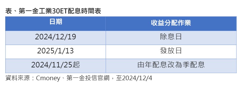 第一金投信指出,第一金工業30 ETF收益分配頻率由年度收益分配,變更為每季收益分配,除息月份預計為3月、6月、9月及12月,同時也正式納入「收益平準金」,未來有利穩定股息配發機制。