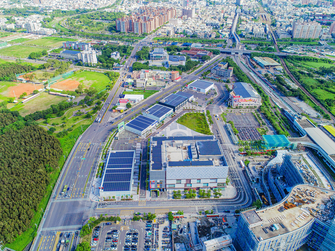 位於高雄S廊帶的起點「岡山樂購廣場 」是首家結合影城的大型購物商場,屋頂光電設置容量達323.4kW,連同周遭街邊店家屋頂光電總設置容量已達2MW,充分展現建築物結合再生能源的複合式利用,降溫隔熱同時更活用了屋頂的閒置空間,為本市能源轉型共盡一份心力,是為本市邁向淨零城市的先驅,也是高雄創能永續楷模。