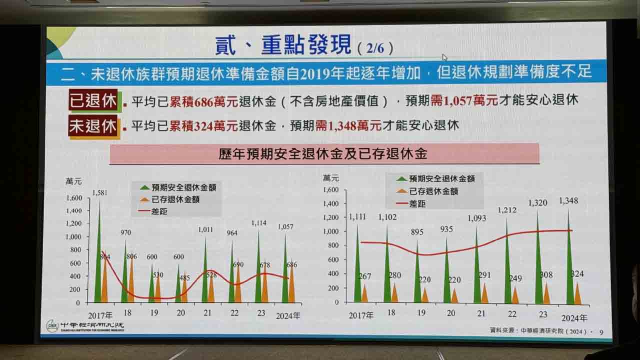 理想退休金與現實資產,差距多遠? 富邦投信委託中華經濟研究院所做的2024年「國人安心樂活享退調查」顯示,已退休族群認為理想可安心退休的存款金額為1057萬元,但受訪者平均實際存款686萬元,差距371萬元;未退休族群的目標則更遠大,認為理想可安心退休存款需1348萬元,但平均實際存款324萬元,缺口高達1024萬元。