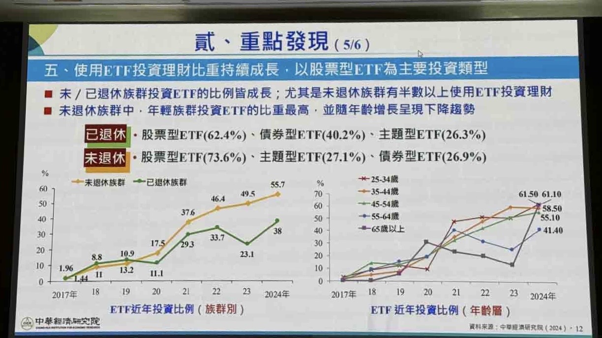 值得一提的是,運用ETF投資理財的比重持續上升,對比2017到2024的歷次調查結果,未退休族群運用ETF的投資比例,已經從1.96%大幅擴增至如今的55.7%,已退休族群也從1.44%上升到38%。