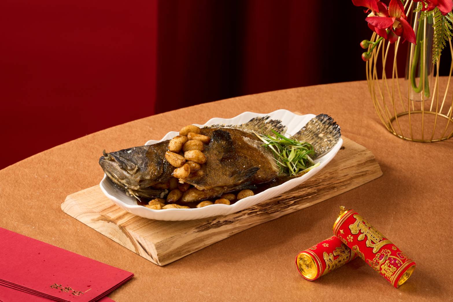 「花膠虎掌燴干貝」膠質豐富、滋補養生,是健康與美味兼具的佳選;「大四喜」(瑤柱獅子頭)選用上等豬絞肉與北海道干貝經繁複手工製作而成,滋味充滿層次感。此外,「蒜子龍虎斑」選用台灣飼養的龍虎斑,魚肉細緻,搭配香濃醬汁煨煮至收汁;「富貴雙方」則以蜜汁金華火腿搭配酥脆豆腐皮,甜鹹交融,展現雙重福氣與圓滿團圓;最後清甜不膩的「桂圓紅棗燉銀耳」作為圍爐宴的完美結尾。
