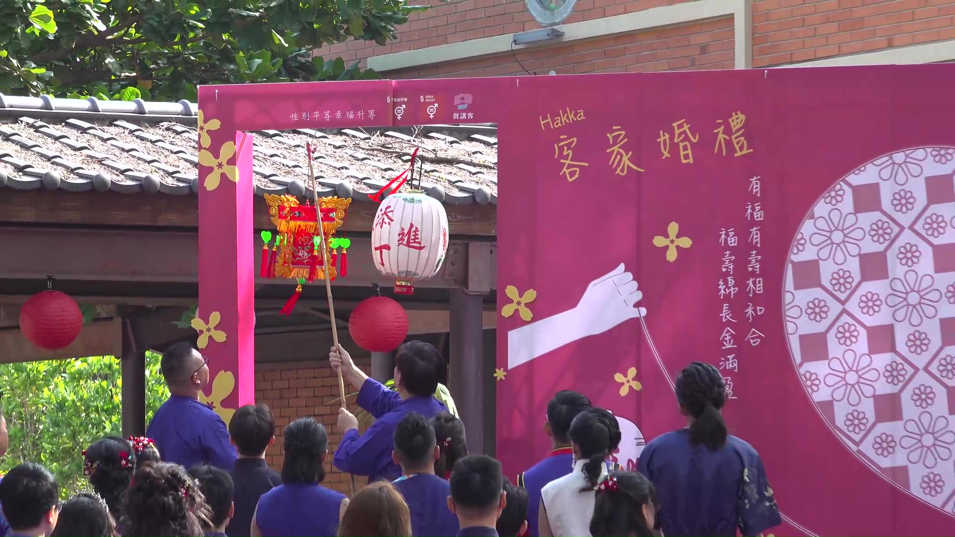 新人們在彩旗飄揚與八音樂聲的襯托下,由象徵吉祥的帶路雞引領,身著典雅的客家禮服緩緩進場。典禮中進行「上燈」、「插頭花」與「食新人茶」等象徵家庭和睦與感恩長輩的傳統儀式,既展現對長輩的敬重,也為新人生活揭開幸福序幕。整場婚禮儀式充滿濃厚的文化氛圍,每個細節都傳遞出客家文化對家庭價值與傳統精神的珍視。