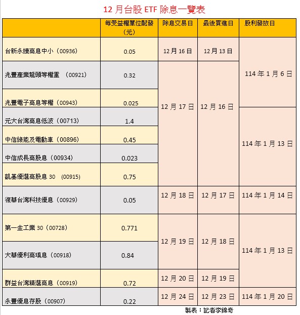 緊接著,12月17日是本月除息旺日,包括兆豐投信旗下兩檔等權重ETF:兆豐龍頭等權重(00921)、兆豐電子高息等權(00943),分別要配息0.32元與0.025元,想參與領息的投資人,最後買進日都是 12月16日,明年1月6日領到錢。
