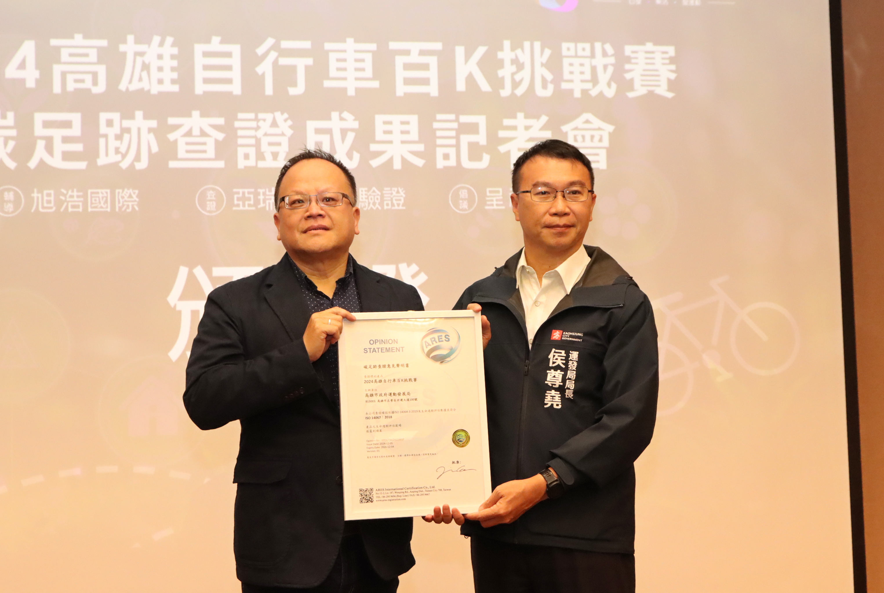 ↑圖說:亞瑞仕國際驗證贊助執行市府運發局推動自行車碳足跡查證,圖左亞瑞仕陳勁宇董事長,圖右運發局長侯尊堯。(圖片來源:高雄市運發局提供)