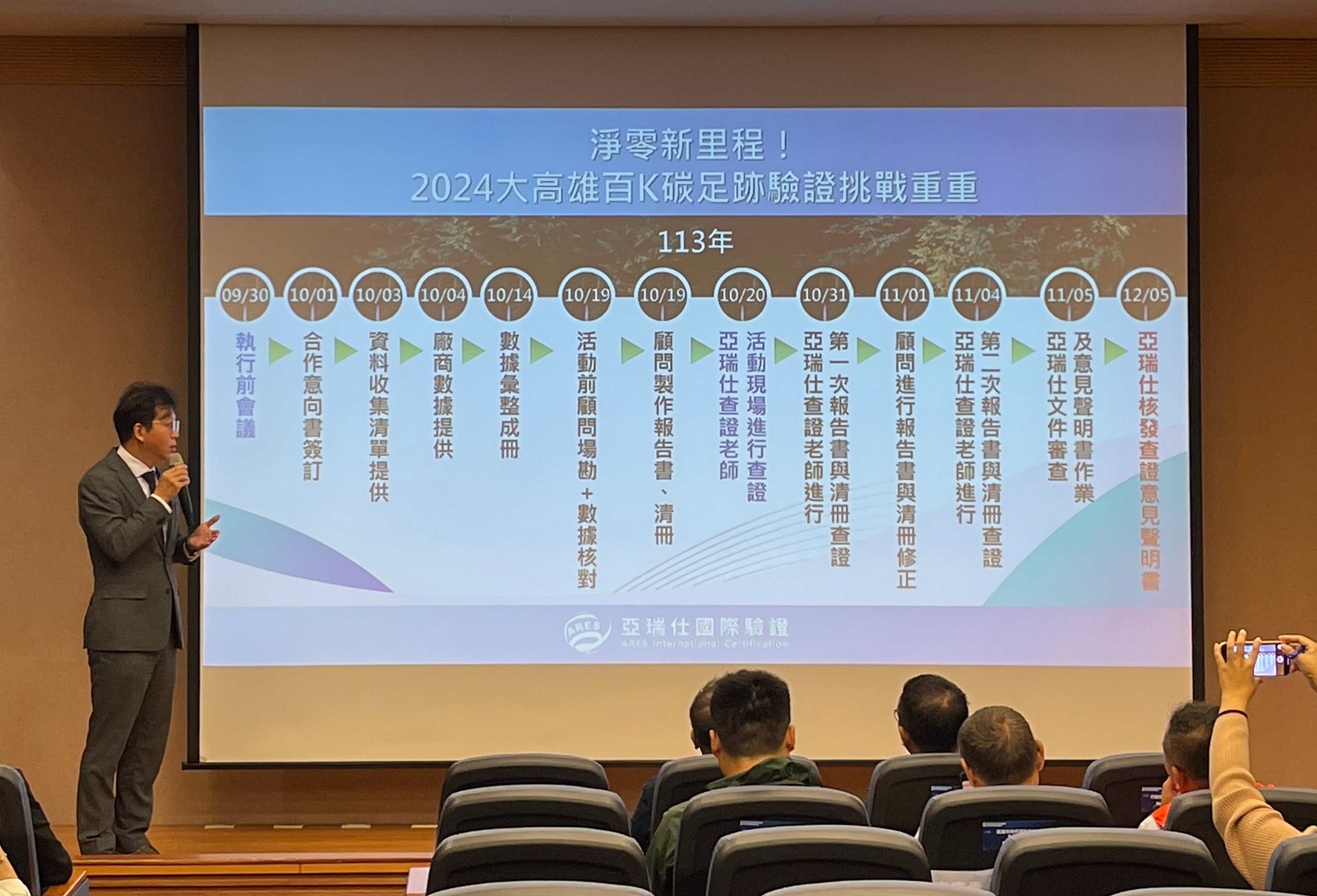 ↑圖說:亞瑞仕國際驗證陳建璋總經理說明活動碳足跡查證結果(圖片來源:高雄市運發局提供)