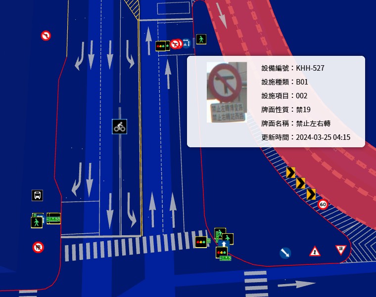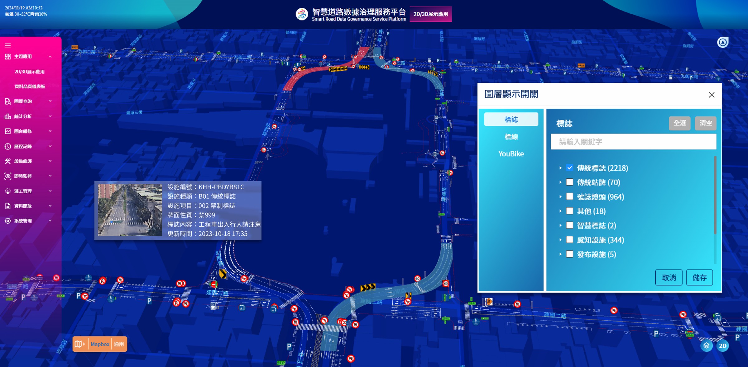 鼎漢同時建置了2D/3D展示圖台,結合道路設施與建築模型,完整呈現高雄市交通場域的三維資產地圖。透過該圖台,可查詢特定設施的現況,輔助設施盤點與管理。此項技術亦為後續數位分身(Digital Twin)及智慧道路應用提供整合平台,為高雄市智慧交通系統的發展鋪設堅實基礎。