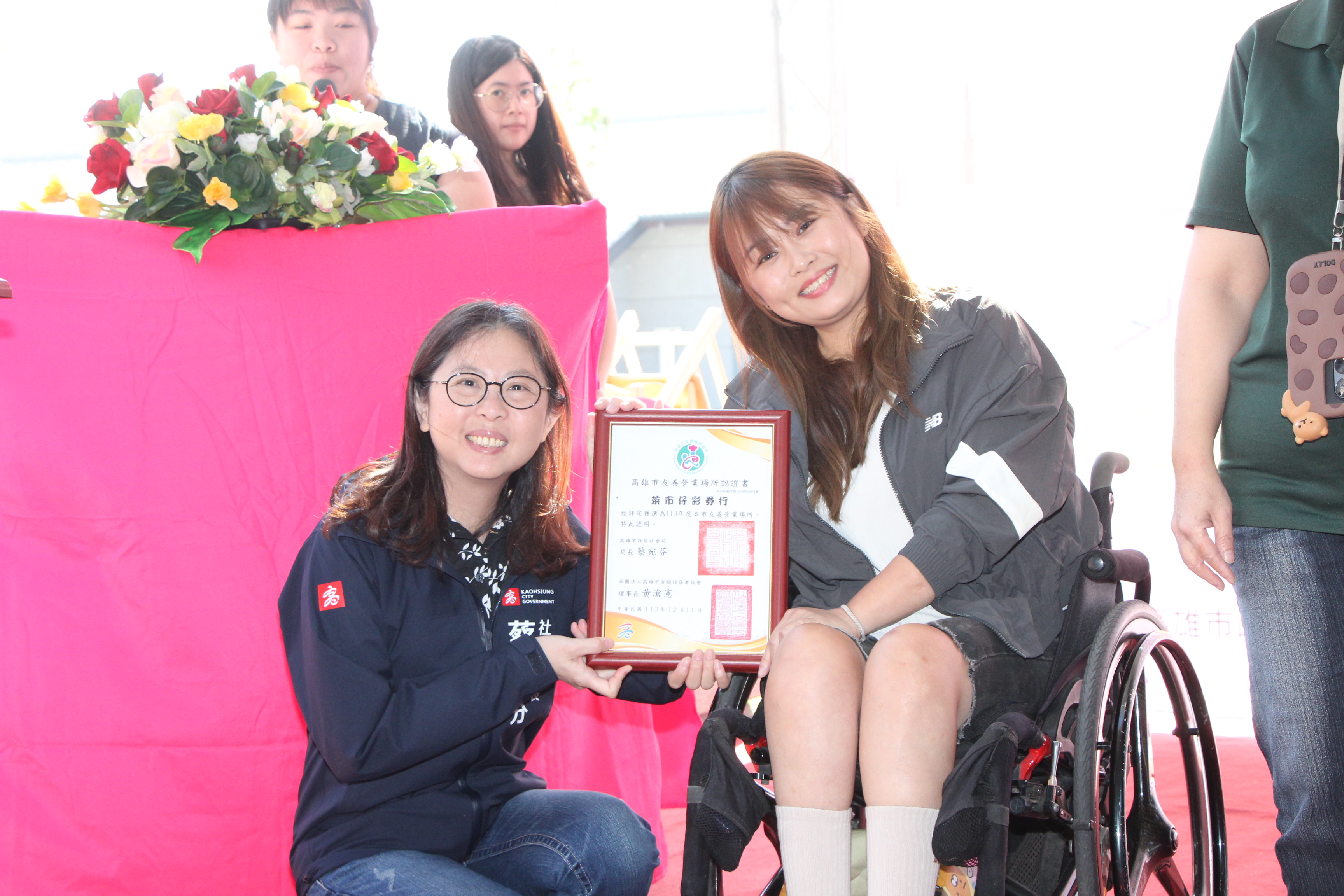 ↑圖說:社會局局長蔡宛芬頒贈友善營業場所認證給菜市仔彩券行陳姿予負責人(圖片來源:高雄市社會局提供)