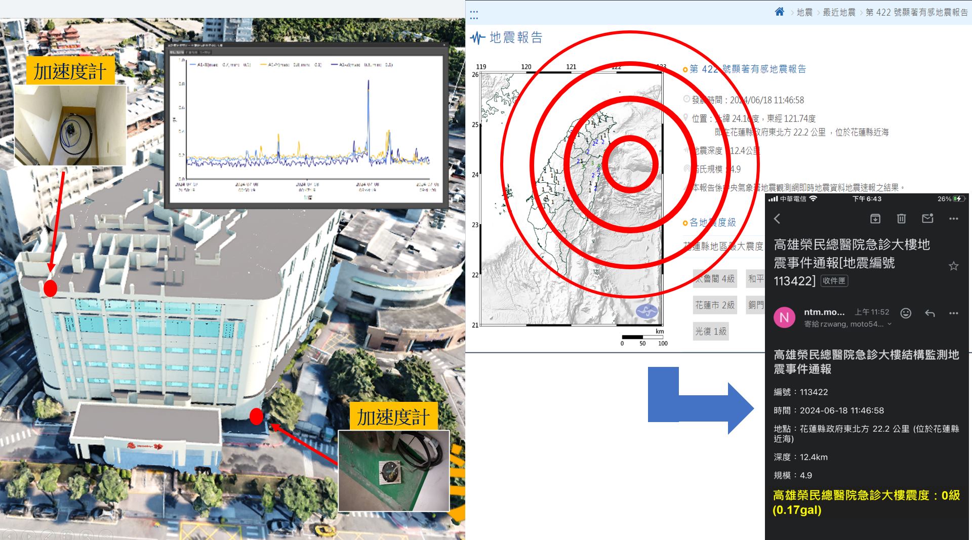 工務局長楊欽富指出,數位孿生技術就像城市的「智慧工程師」,全天候監控城市基礎設施的安全。以建物為例,平台能即時監測結構物的穩定性,當災害發生時,迅速通報建築物受損情況,協助政府立即掌握震後危老建築、養老院及關鍵基礎建築的安全狀態,並提供補強建議,有效提升地震災害救援的效率與準確性。未來,這項技術將推廣至全市所有建物,實現全面的智慧監控。