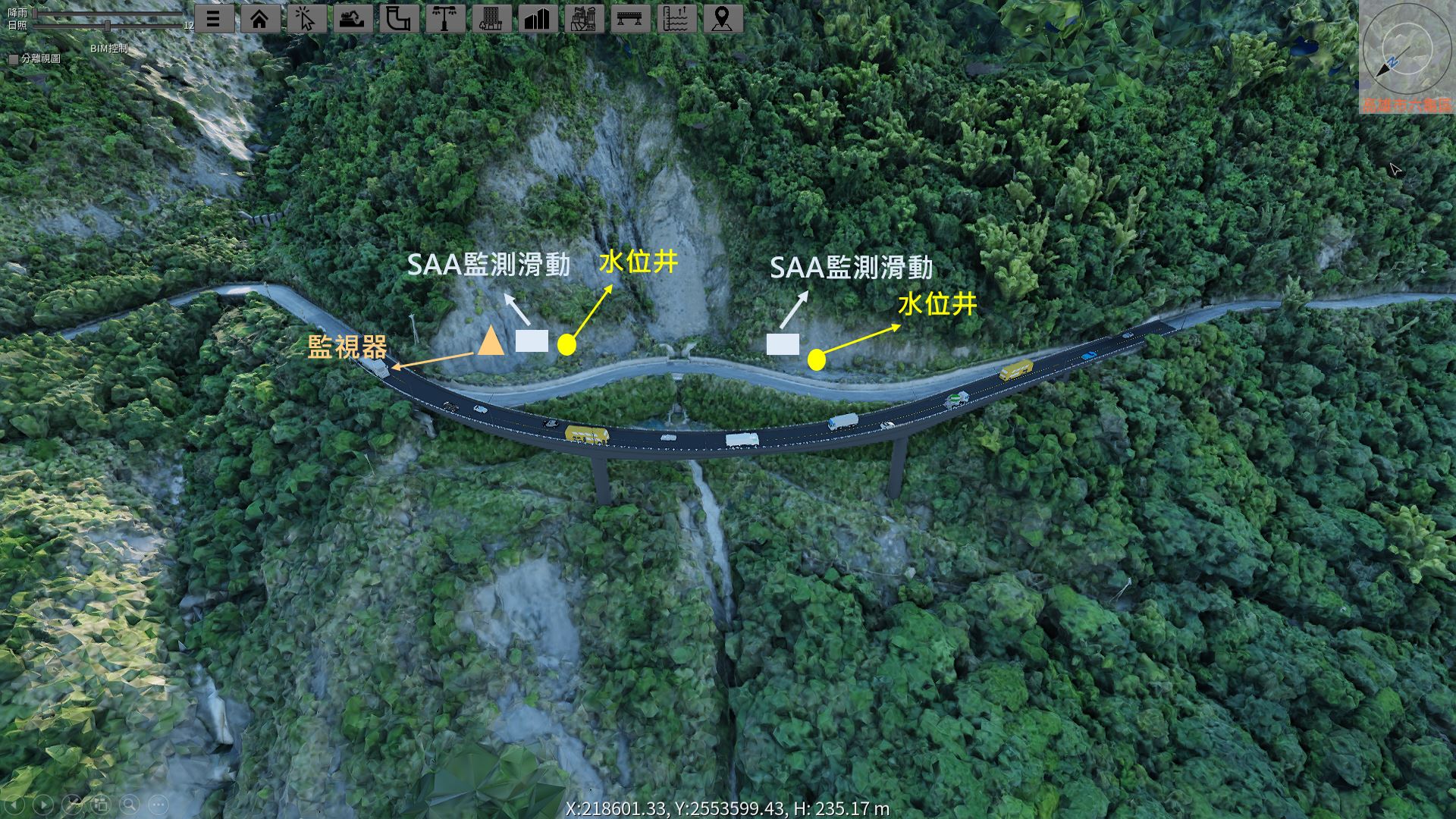 此外,針對道路及邊坡的安全監測,平台運用光達掃描與3D空拍技術,結合自動化監測設備如傾度管、雨量計及水位計,進行邊坡變形與環境數據的長期追蹤。平台透過AI演算法,分析雨量與地下水位變化,預測邊坡安全警戒值。在凱米颱風期間,系統成功提前預警,避免了邊坡坍塌可能帶來的車輛及人員傷亡,展現了數位孿生邊坡技術的實用價值。