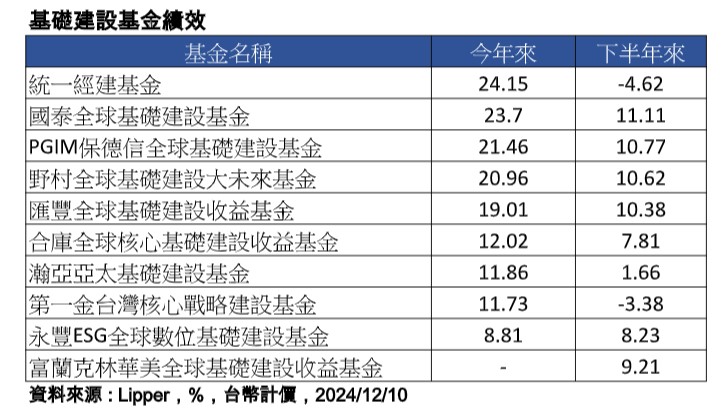 國內投信發行的基礎建設相關基金,今年以來有多襠績效超過20%,包括PGIM保德信全球基礎建設基金21.46%、統一經建基金24.15%、國泰全球基礎建設基金23.7%、野村全球基礎建設大未來基金20.96%。