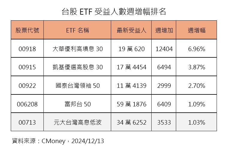 如果把時間拉短來看,最近一週受益人增加最多的是大華優利高填息30(00918),其次是凱基優選高股息30(00915)以及國泰台灣領袖50(00922)。