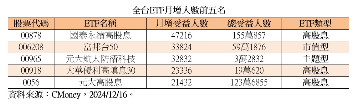 台股ETF受益人數突破1021萬人,近1個月增加10.2萬人,其中又以高股息ETF最受投資人喜愛,冠軍由國泰永續高股息(00878)奪下,月增受益人數4萬7216人,總受益人數超過155萬人,再創新高;大華優利高填息30(00918)、元大高股息(0056)也都榜上有名,受益人月增人數分別為2萬3336人以及2萬1432人。
