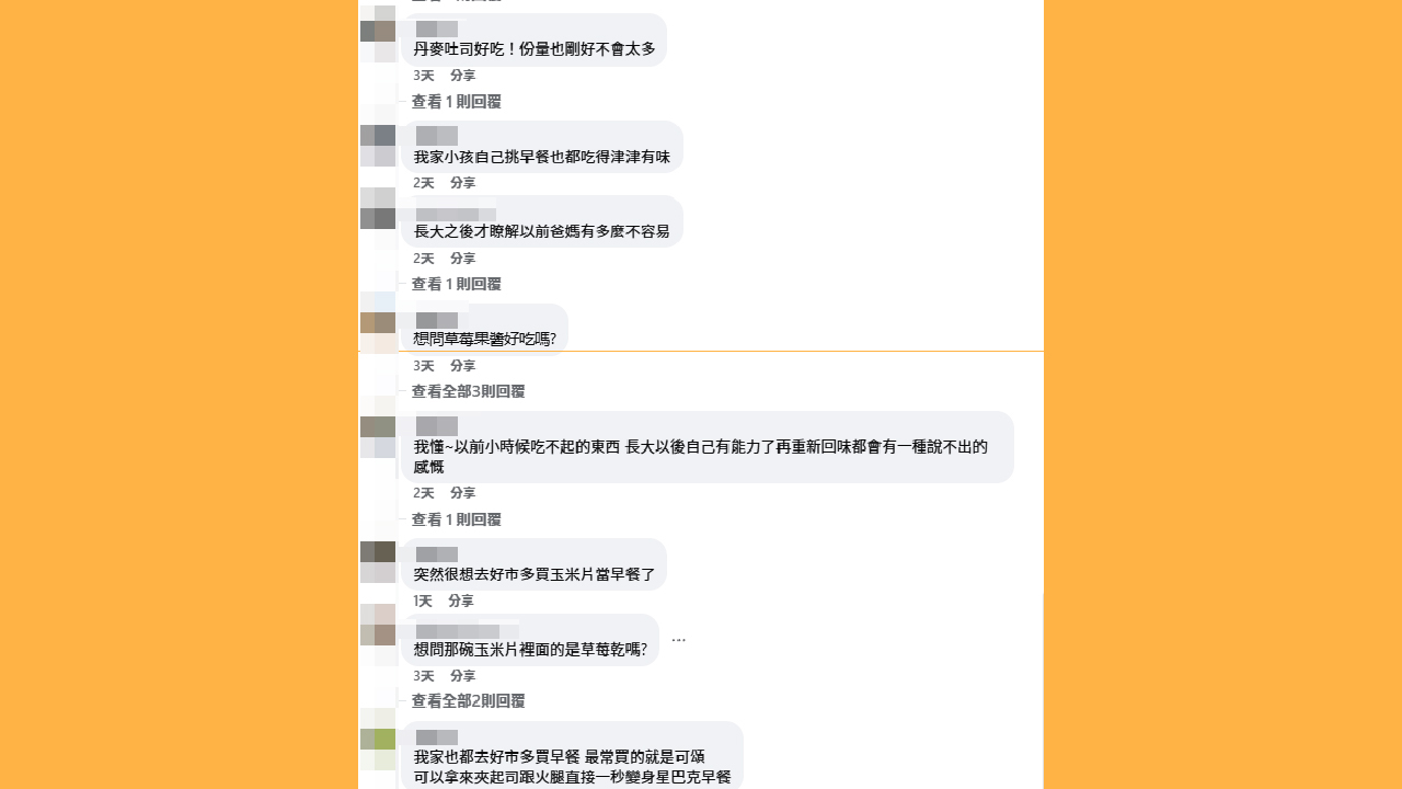 網友分享,他們家小孩選擇了丹麥吐司搭配草莓果醬,結果短短兩天,整包吐司就被「KO」。而家中爸爸則挑了一盒家樂氏玉米片作為早餐,讓媽媽回憶起小時候的時光:「以前和兄弟姊妹為了一盒玉米片總是爭搶著吃,還會吵著爸媽再買,但爸媽總說太貴了。現在回味童年的味道,終於可以不用省著吃了!」