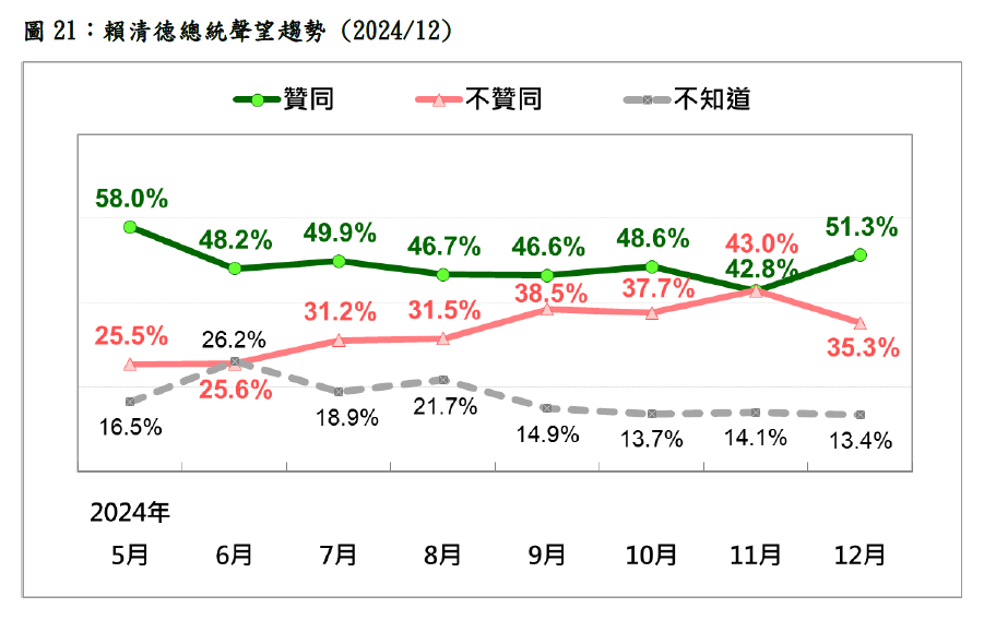 但有趣的是,這次風波並沒有燒到總統賴清德身上,民調問及「賴清德總統上任近七個月,一般說來,您贊同或不贊同他處理國家大事的方式,包括重要人事安排與政策?」時,結果發現贊同者佔多數,結果發現:12.7%非常贊同,38.6%還算贊同,20.9%不太贊同,14.4%一點也不贊同,計算下來,贊同者竟比不贊同者多16個百分點。