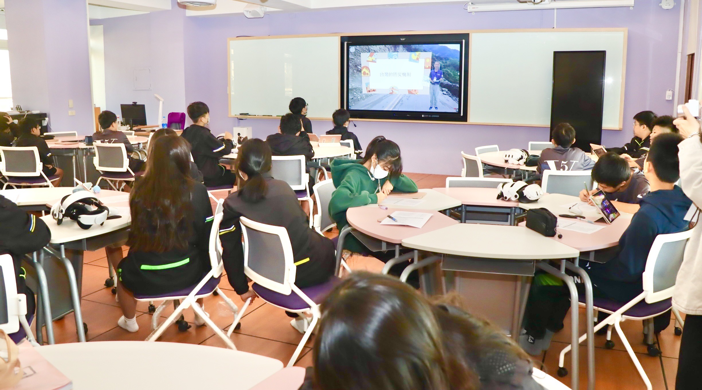 英明國中校長田佳立表示,校內的XR數位共學中心是教育部與市府大力支持的成果,建置完成後成為專屬於直播與互動課程的教學場域。公開課程中,學生通過沉浸式VR教材進行多元視角學習,從人文到科學實務全面探索《防災特攻隊》的課程內容,並與其他學校學生進行互動,充分發揮跨校共學的潛力,展現科技教學帶來的高效益。