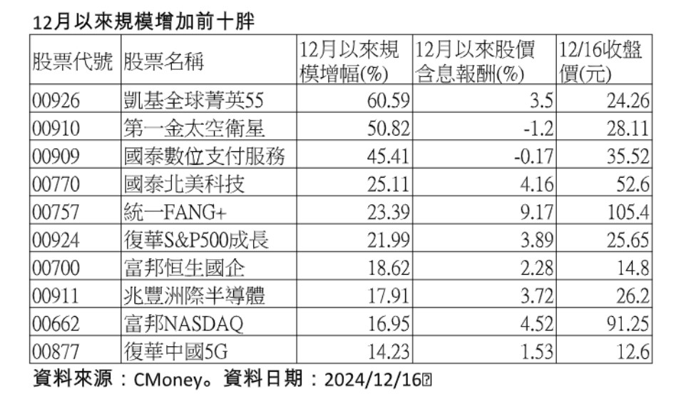 台股ETF發燒,海外股票型ETF也是強強滾,統計12月以來截至16日為止,基金規模長胖的前十檔,增幅都有雙位數以上,居首的是凱基全球菁英55(00926),規模成長60.59%,其後包括第一金太空衛星(00910)成長50.82%、國泰數位支付服務(00909)成長45.41%、國泰北美科技(00770)成長25.11%、統一FANG+(00757)成長23.39%、復華S&P500成長(00924)成長21.99%。