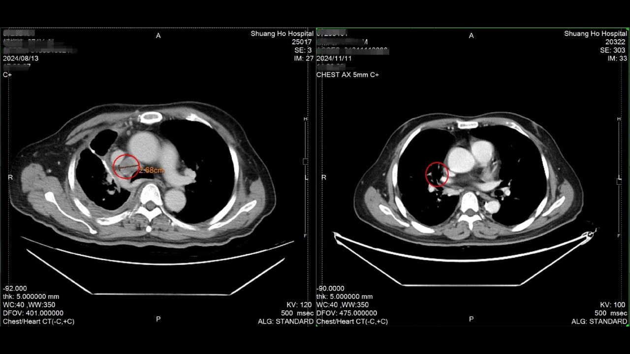 雙和醫院血液腫瘤科主任謝燿宇醫師指出,從治療前的影像檢查中可明顯看到肺部腫瘤持續擴大,除透過基因篩檢找出合適的標靶藥物外,合併搭配每劑間隔兩周,共六劑的DC-CIK細胞回輸治療也是關鍵,後續透過電腦斷層檢查可明顯看到腫瘤縮小,部分腫瘤甚至消失;除療效顯著外,更重要的是幾乎無副作用產生,精神與體力並無影響,未來只需按照醫囑定期回診即可。