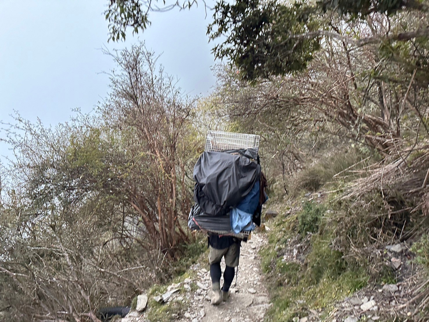 ↑圖說:因犬隻具攻擊性,為保障人員安全與高效率移除犬隻,由背工將40公斤重的誘捕籠扛下山,歷經4小時徒步8.5公里到達,創下嘉畜所最高海拔防疫記錄。(圖片來源:嘉畜所提供)