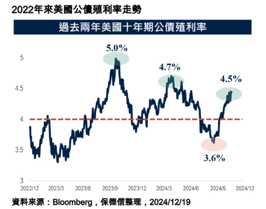 針對當前局勢,王誠宏提出兩點觀察:首先是「殖利率走勢已充分反映市場預期」,10年期公債殖利率的上揚與市場對川普政策的預期有密切關聯,回顧川普競選後期、民調上升時,10年期殖利率即開始上行,確認當選後進一步攀升。主要原因在於「課徵關稅」及「企業減稅」這兩大政策推升通膨預期,帶動殖利率上升。然而,聯準會已針對政策不確定性進行調整,包括小幅上修通膨預期及縮減降息幅度。他強調,「所有方向已反映完畢,殖利率上升空間有限,市場應無須過度擔心」。