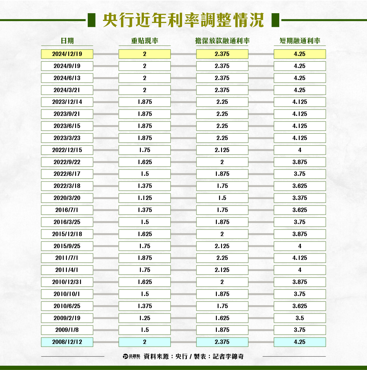 中央銀行今天舉行今年最後一次理監事會議,決議利率凍漲,維持連續第三季不調整,重貼現率、擔保放款融通利率及短期融通利率,維持在2%、2.375%及4.25%,利率水準維持16年(2008年12月)以來的高水位。