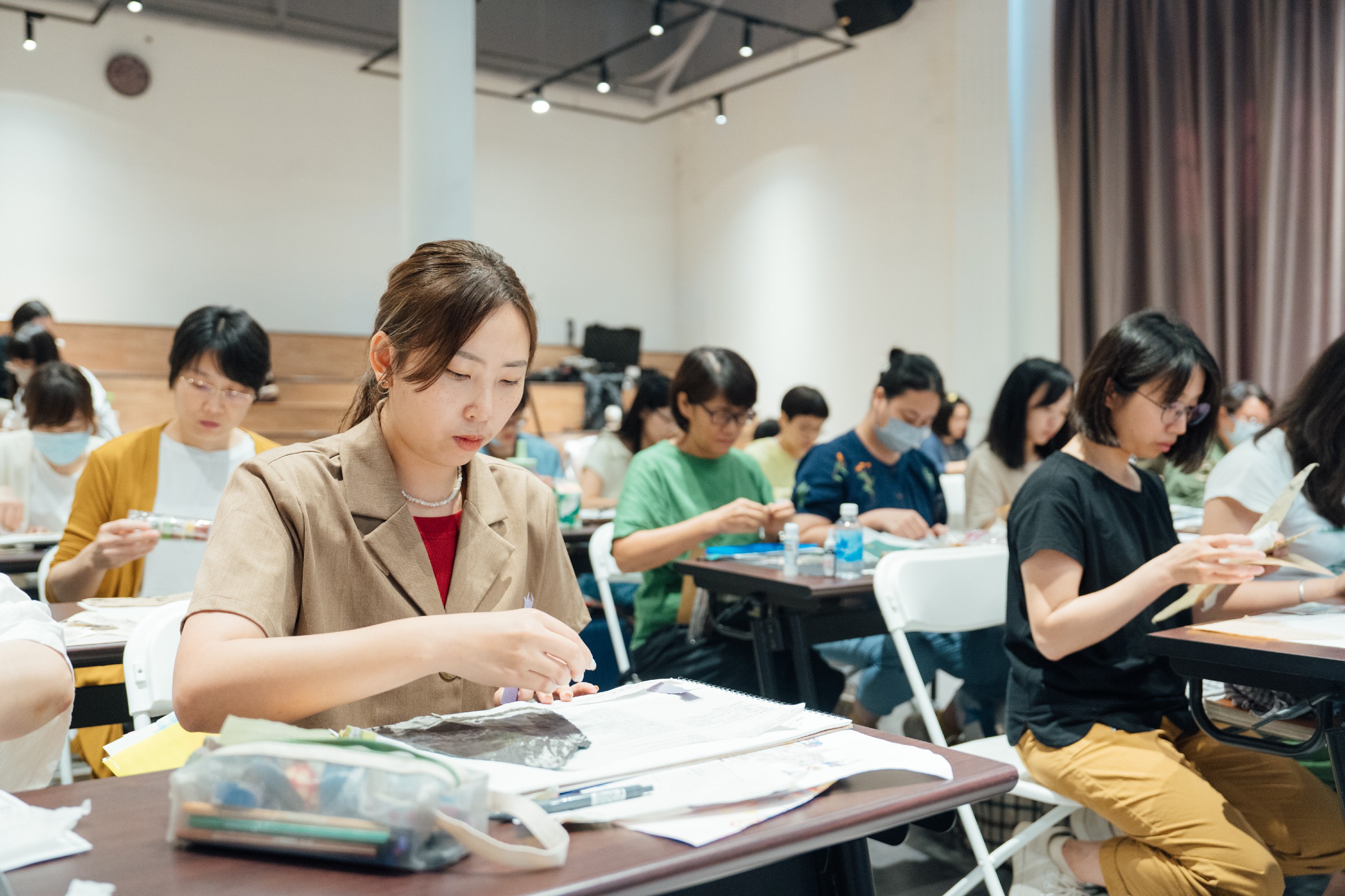 ↑圖說:曾獲義大利波隆那加茲童書獎首獎的客座講師林廉恩,於2024年創作班帶領學員實作複合媒材拼貼來呈現故事畫面。(圖片來源:高雄市立圖書館提供)