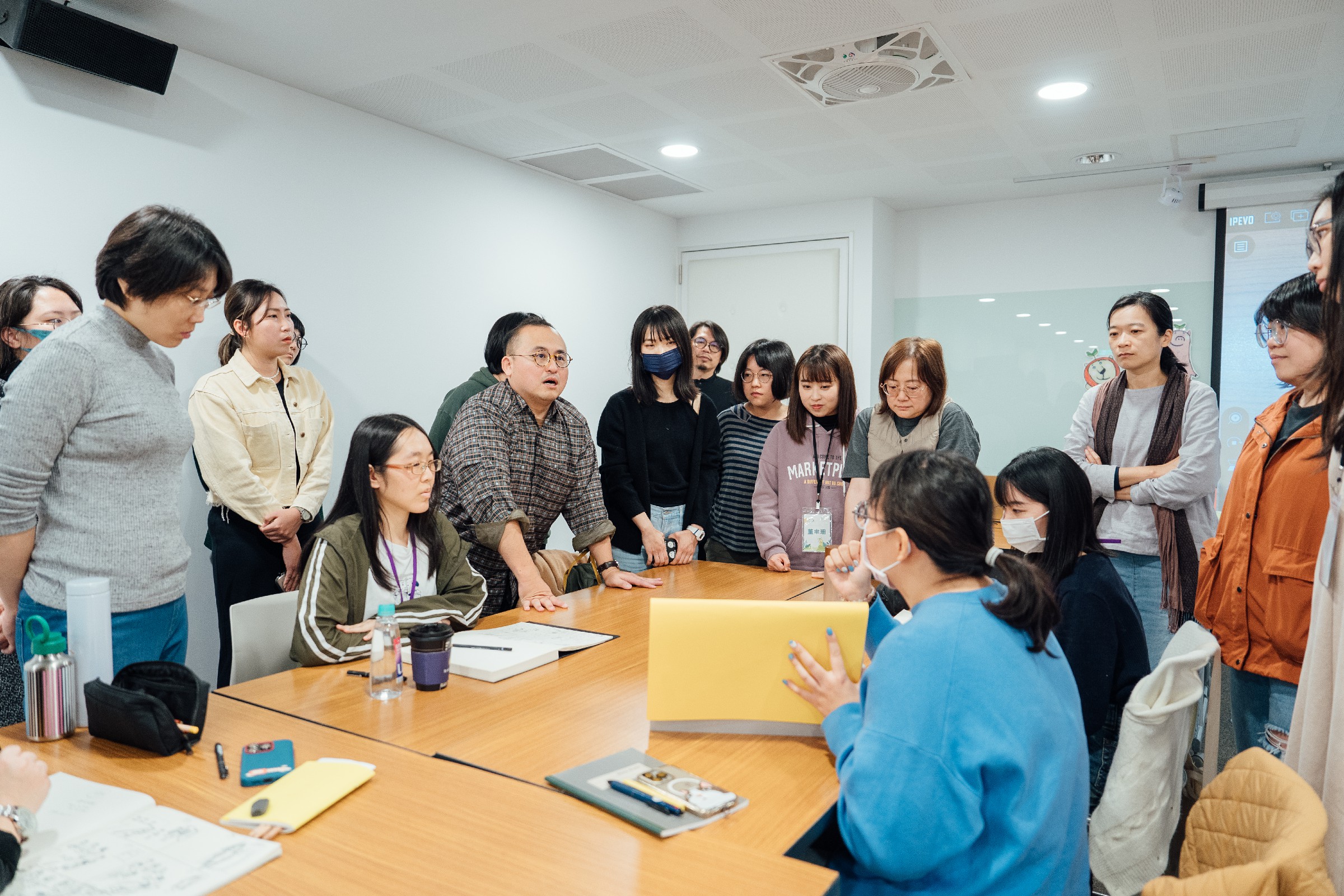 ↑圖說:跨足戲劇與繪本專長的客座講師Ballboss(左五)運用課堂實作練習,引導及帶領學員如何架構故事。(圖片來源:高雄市立圖書館提供)