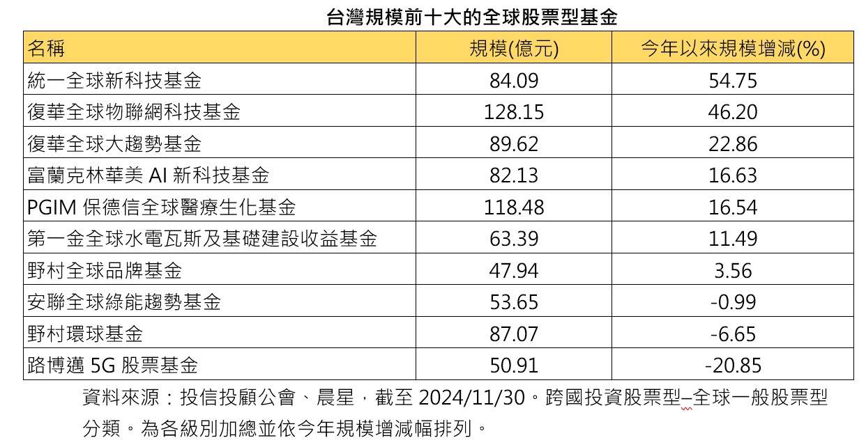 晨星統計至11月底,在台發行的全球股票型基金,規模前十大當中,過半數聚焦於科技,反映生成式AI引領全球趨勢,科技股依舊是投資重要主軸。