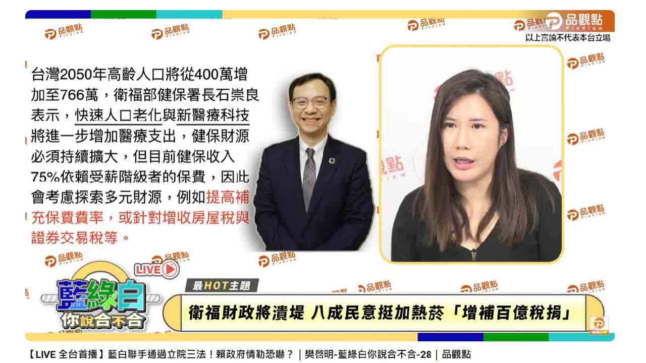 民眾黨發言人吳怡萱今天參加品觀點「藍綠白你說合不合」節目指出,加稅對健保補充財源來說,始終都是一種不穩定的財政收入方式,因為這都是挖東牆補西牆;根本之道是改善健保或社福支出的體質,不是一蹴可及,加上台灣已經進入高齡化的社會,健保和社福都會不斷增加支出,再不補足相關缺口,就會變成永遠填不平的天坑。