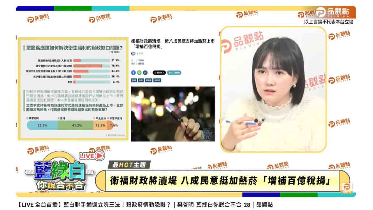 ↑圖說:民眾黨發言人吳怡萱認為,增加稅收是不穩定的財政收入方式,最後將陷於挖東牆補西牆的無間道輪迴,而最新民調也顯示,將近八成的民意支持,政府加速開放加熱菸上市,讓徵得加熱菸稅捐可以挹注健康福利政策的支出。(圖片來源:品觀點)