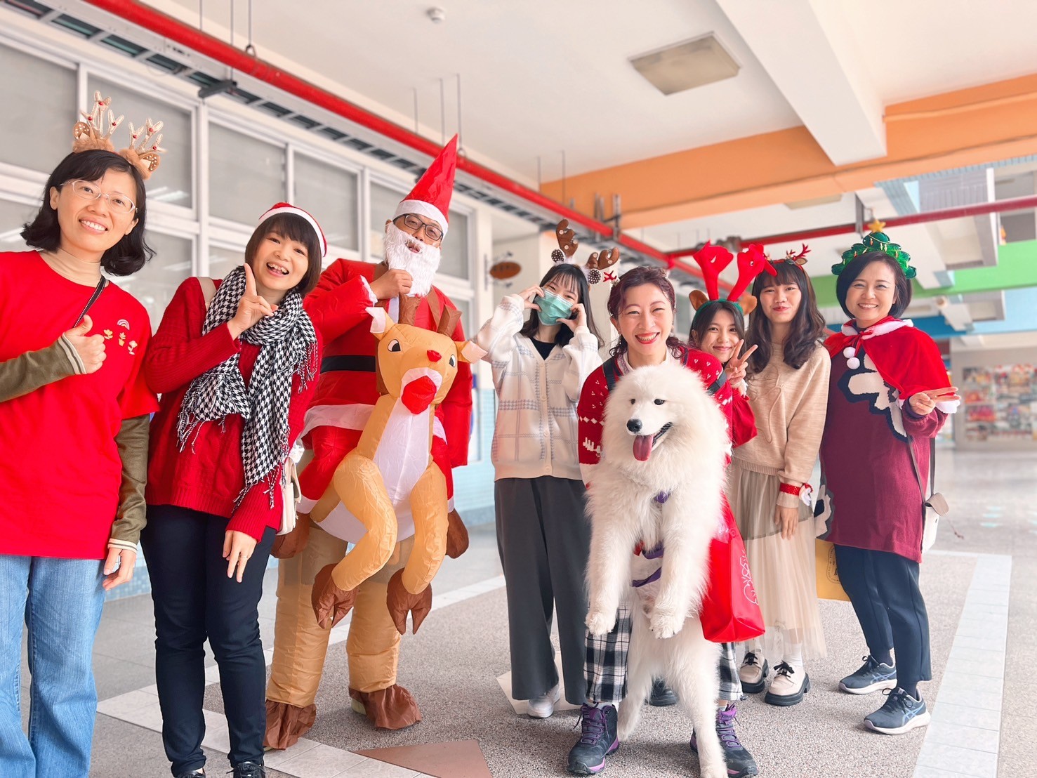 毛茸茸的薩摩耶犬又稱「微笑天使」,雪白壯碩的身體,相當聰明活潑。生教組長柯文顏更是與平時嚴肅樣貌不同,扮成騎著麋鹿的聖誕老公公,雪橇犬拉著精心裝飾的雪橇,將滿滿一雪橇的糖果分送給孩子,送上真摯的聖誕祝福,願所有的孩子在這個節日充滿快樂與溫暖。
