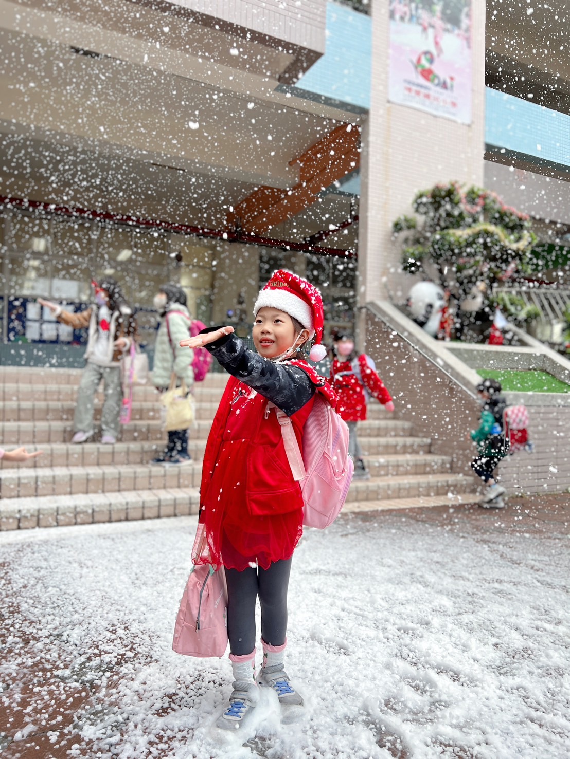 學校主任陳琬婷帶著總務處夥伴,從二樓用雪花機噴出陣陣雪花,博愛大道漫天飄雪,好多孩子看到地上有白白的雪堆積在地面,顯得相當驚喜,好幾個孩子還在降雪區內轉圈圈,讓雪花降落在頭頂上,捨不得離開。
