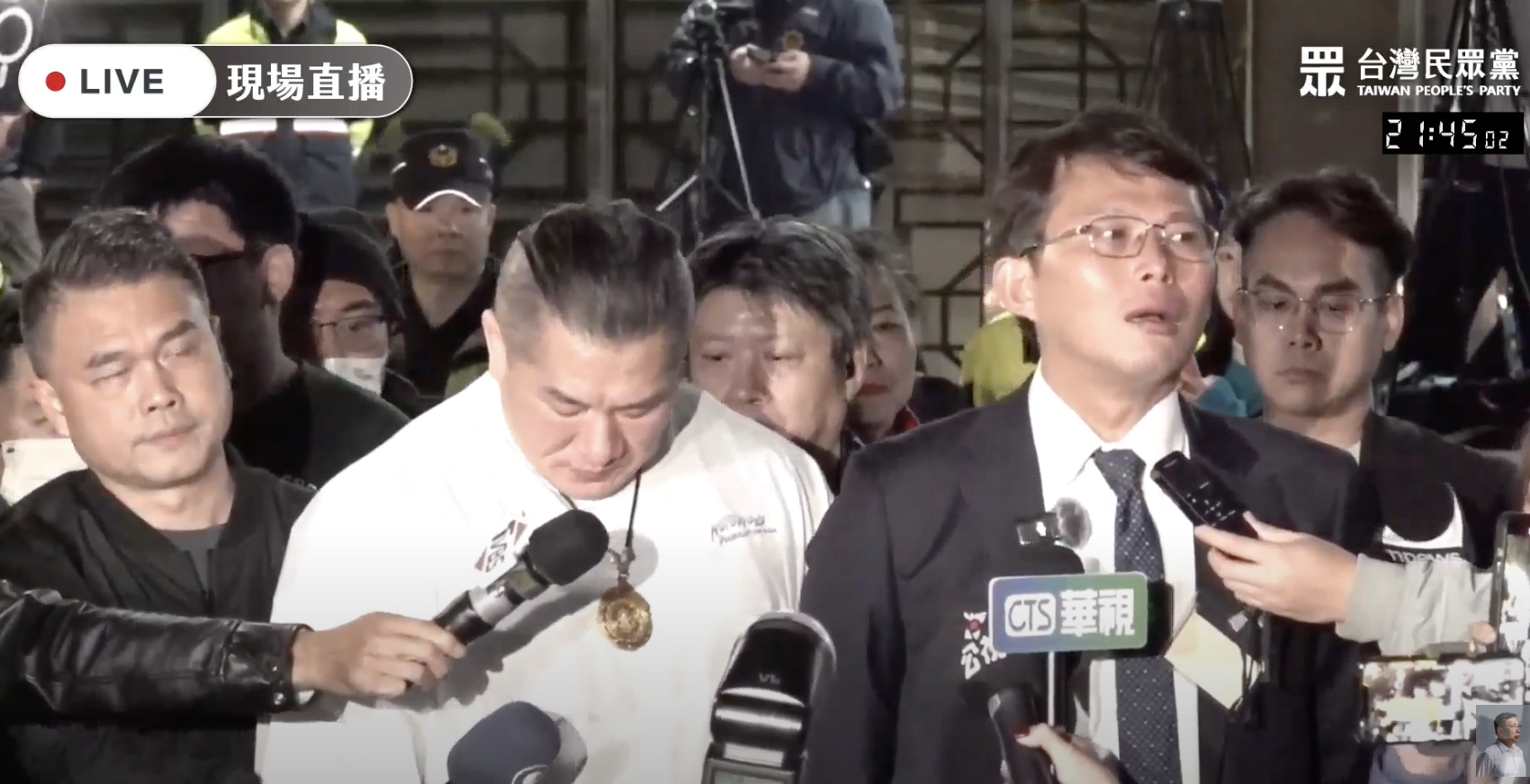 台北地院26日晚間審理柯文哲等5名被告羈押案,場外支持者已突破千人。民眾黨立委黃國昌晚間9點40分步出法院,發表15分鐘談話時一度哽咽。