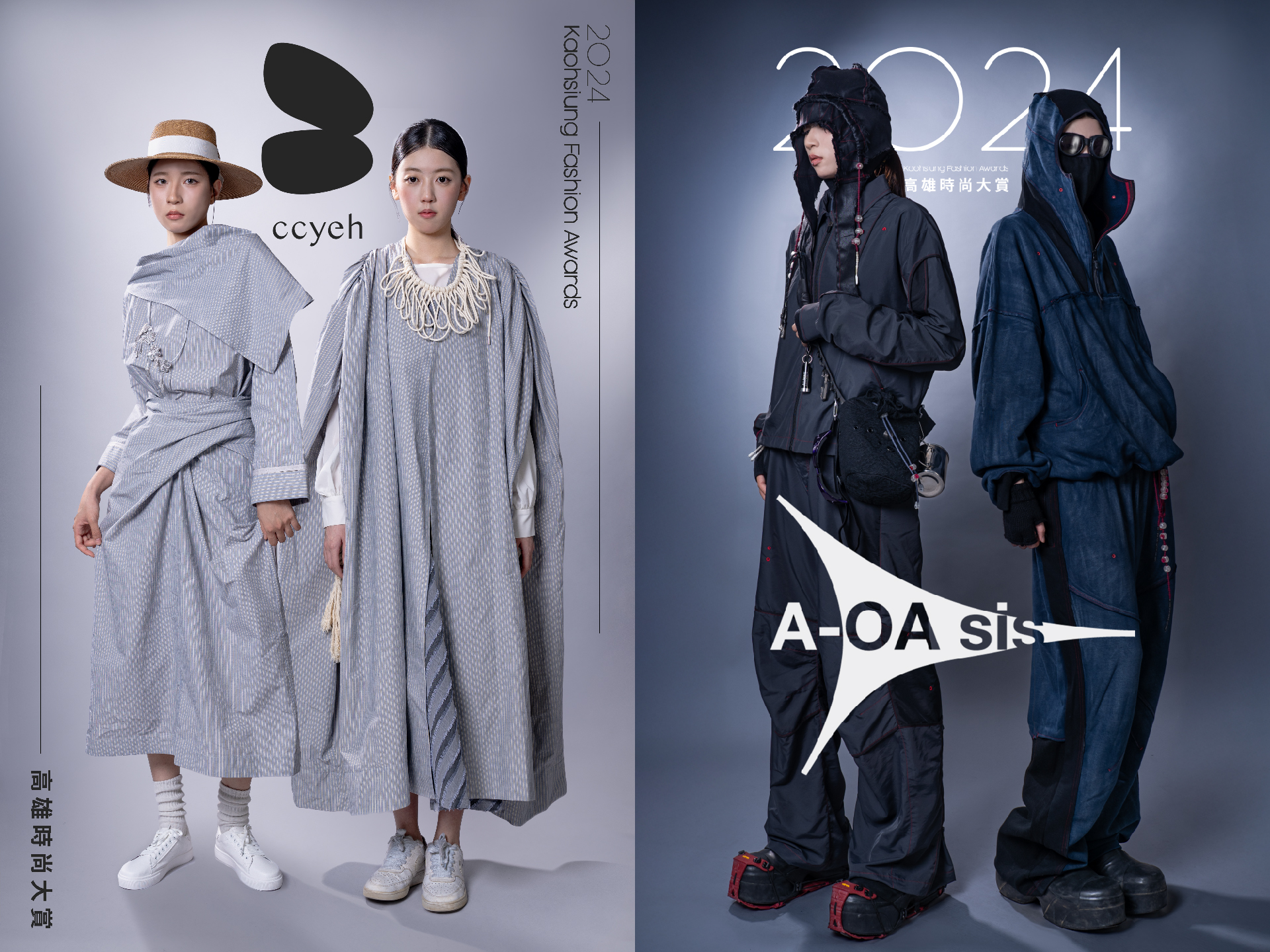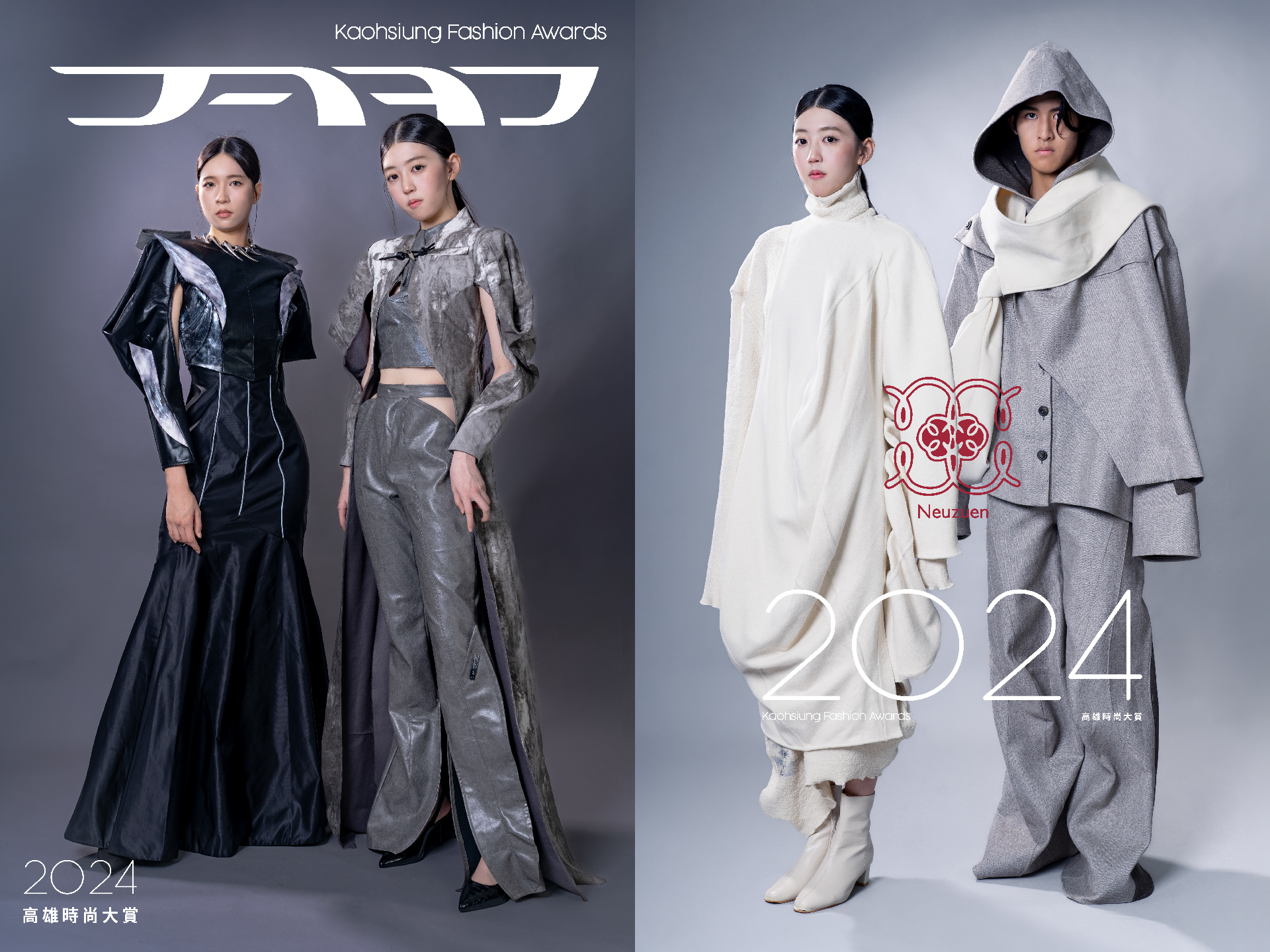↑圖說:品牌「Jeffrey Yao」(左)靈感來自台灣常見自然災害-颱風,並將新聞畫面、颱風衛星圖等意象印花融合進服飾創作;品牌「Neuzuen」(右)系列來自身在異鄉的省思,模擬出家在心中的概念。(圖片來源:高雄市青年局提供)